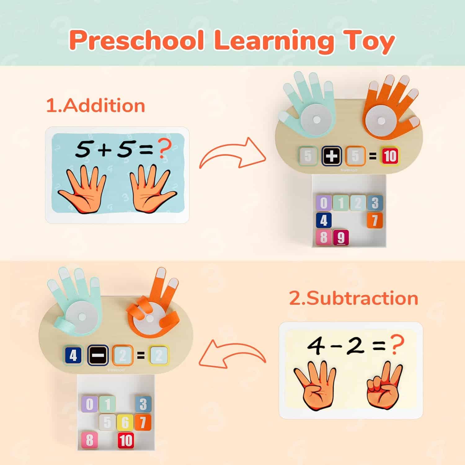 - Number Counting for Kids : This preschool educational toy is composed of 12 vibrant wooden number blocks, 2 soft felt palms 10 double-sided math flashcards, 1 sturdy wooden board and 1 handy storage box. Using velcro fingers is a great way to visualize and understand counting, addition, and subtraction